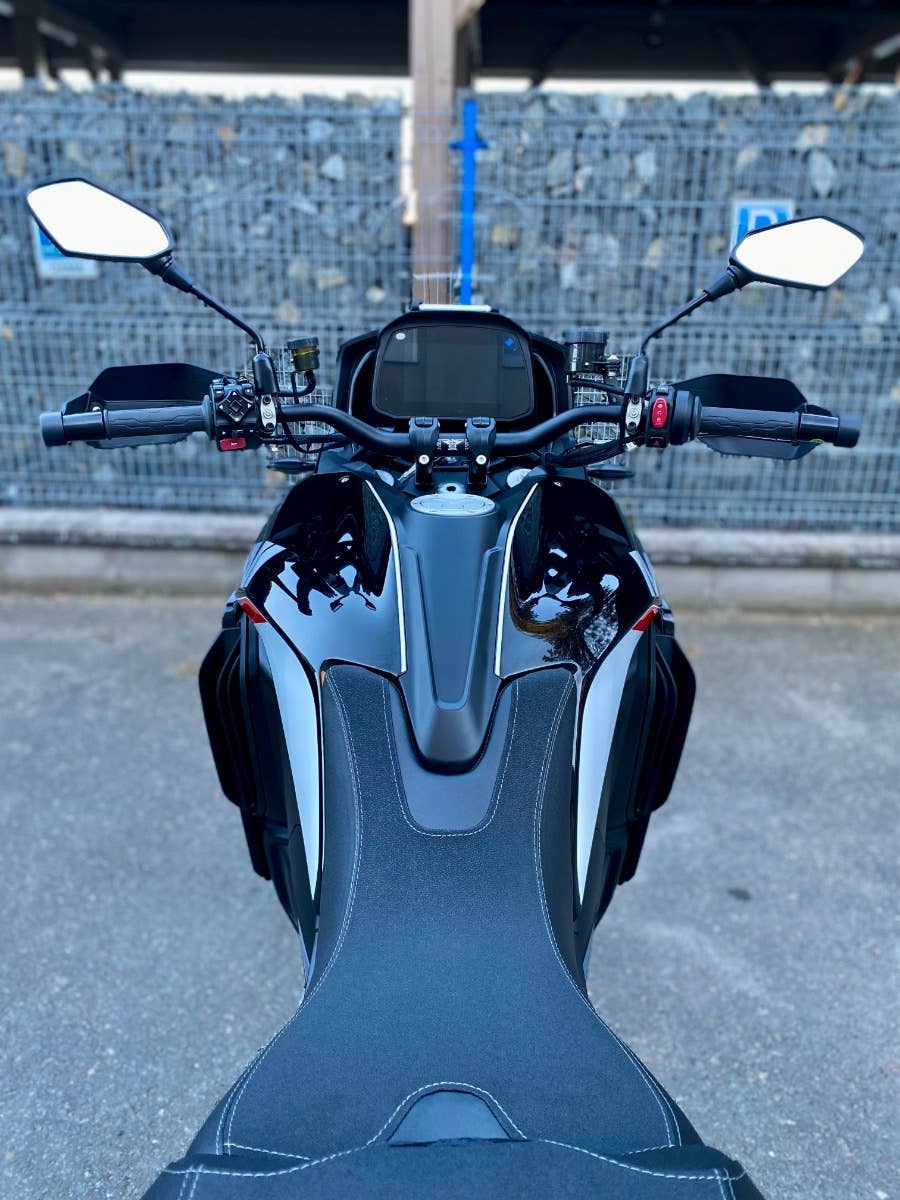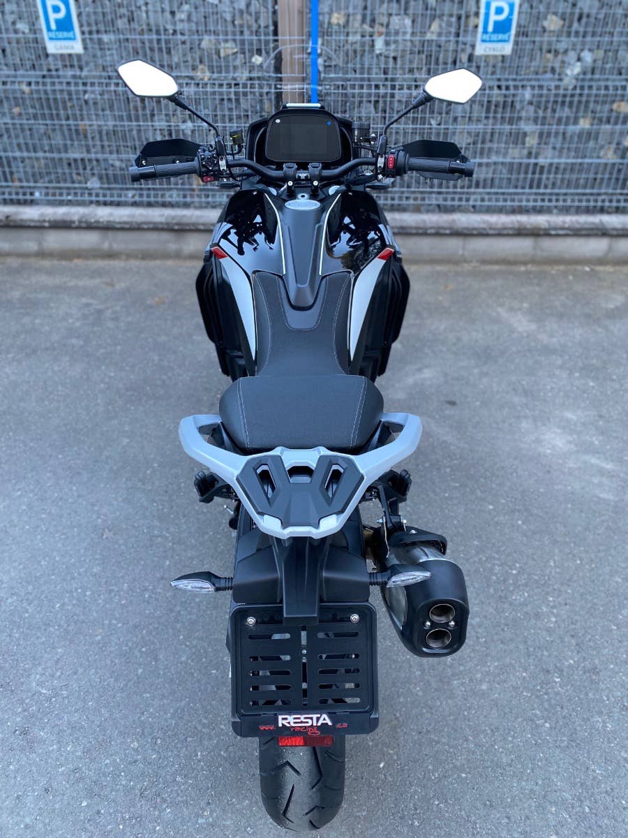 7“ TFT displej, obousměrné rychlořazení, centrální stojan, třístupňové vyhřívání rukojetí chráněných velkoplošnými blástry, vyhřívaná sedla řidiče i spolujezdce, jednou rukou nastavitelné plexi, tempomat, senzory tlaku v pneumatikách nebo zadní radar varující světýlky v zrcátkách před vozidlem v mrtvém úhlu. A to není vše, displej umí i integrovanou navigaci prostřednictvím appky pro iOS i Android, jsou tady také dva USB porty (A a C), přisvěcování do zatáček nebo přední kamera nahrávající nepřetržitě až 15 hodin záznamu.